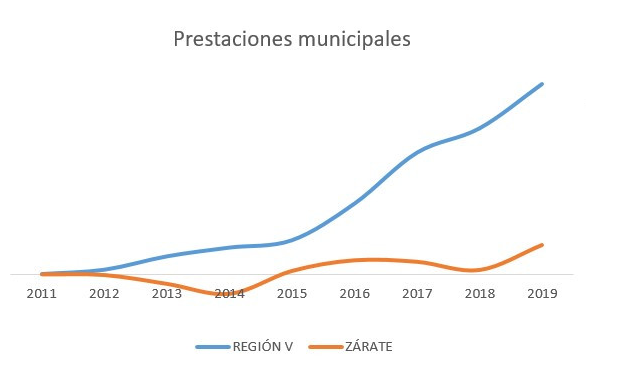 A priori uno podría pensar que en Zárate hubo un corrimiento dentro de las prestaciones estatales en favor de los centros municipales, y en la Región V en favor de los centros provinciales, sin embargo esto no es así porque en ambos casos, y en el caso regional más pronunciado, crecieron las prestaciones en los centros municipales.
