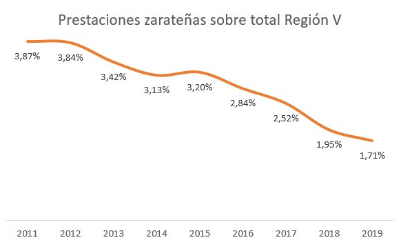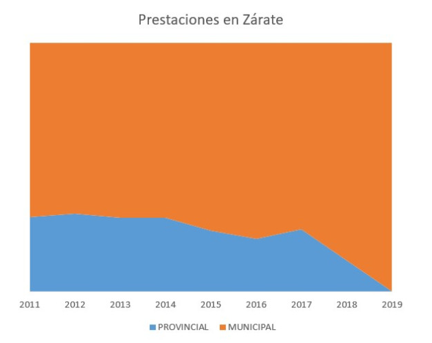 Como se puede observar en el gráfico, la información de 2019 confirma la caída que ya habían sufrido las prestaciones de salud provincial en Zárate el año anterior, situación que se contradice con lo ocurrido en la Región Sanitaria V, donde la salud provincial tuvo una mayor participación en el total de prestaciones médicas y paramédicas durante 2019.
