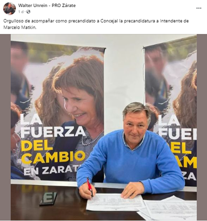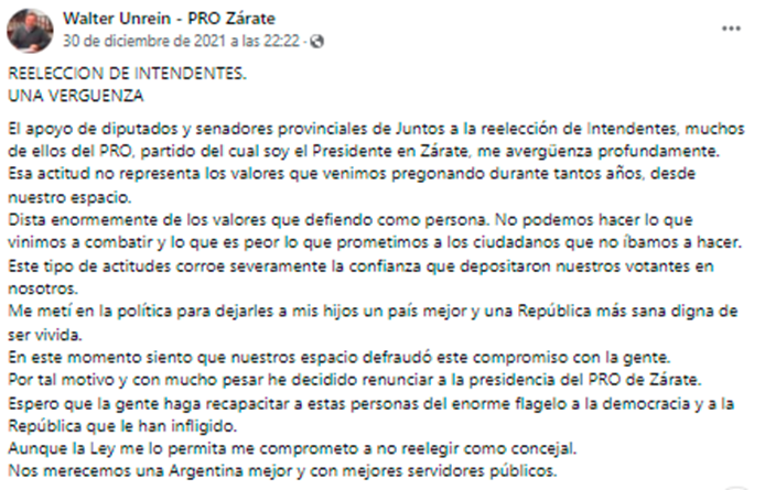 Unrein, además, es el paradigma del doble discurso. Le prometió a los vecinos que no iría por la reelección.